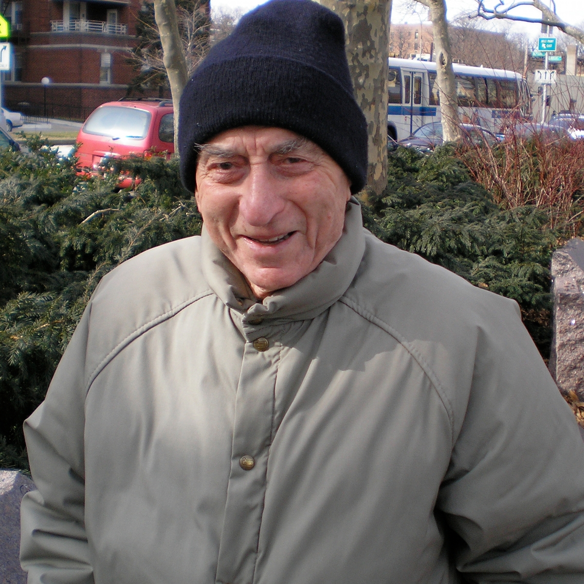 The day before the Kobryn Ghetto was liquidated, Ben was sent on a work party to Zhitomer, Ukraine. He and several friends escaped and made their way on foot back to Kobryn, only to find no one left alive. His mother and two brothers had been murdered by the Germans; later he found that his father was still alive. Ben is pictured here in February, 2008, giving a tour a Holocaust monument near his home in Sheepshead Bay, Brooklyn, NY. |