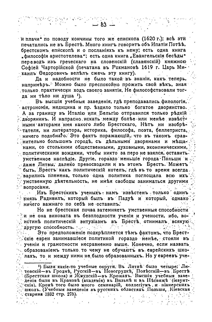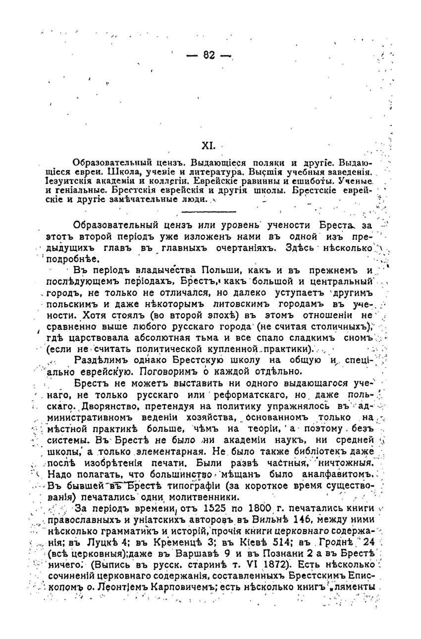 {82} [Chapter Keywords:] Educational qualification. Prominent Poles and others. Prominent Jews. School, teaching and literature. Higher education institutions. Jesuit academy and college. Jewish Ravin and eshiboty. Scientists and brilliant. Brest Jewish and other schools. Brest Jewish and other wonderful people.