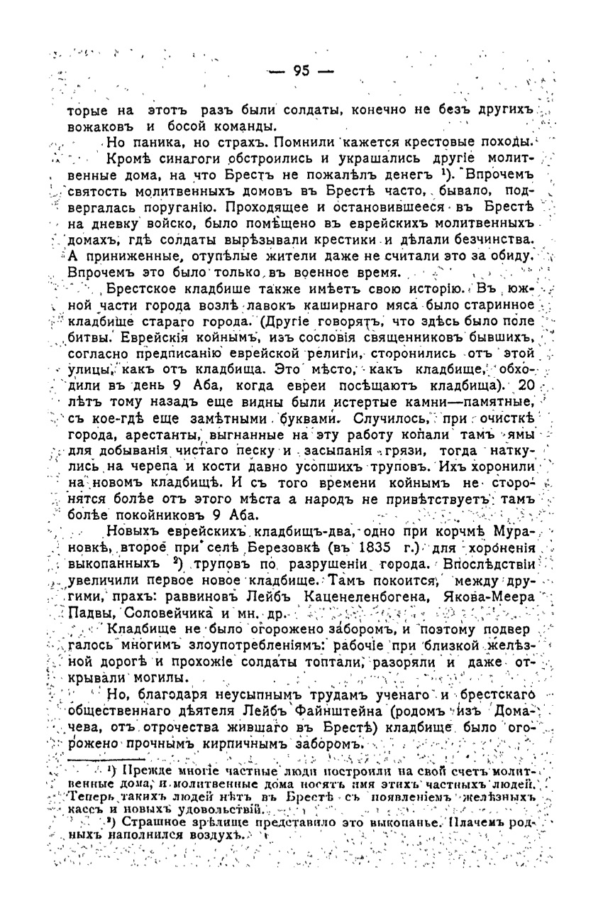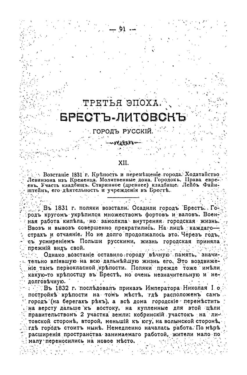 Keywords: Uprising in 1831. Fortress and moving around the city. Application of Levinson from Kremenets. Houses of worship. Town. Jewish rights. The fate of the cemetery. Antique (old) Cemetery; Life Feinstein, its activities and the establishment of Brest.