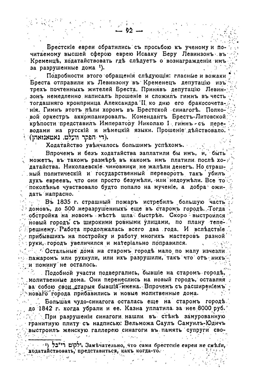 92} Brest Jews appealed to the scientist and esteemed higher sphere Jew Isaac Ber Levinsohn from Kremenets, which should apply to reward them for their destroyed houses.