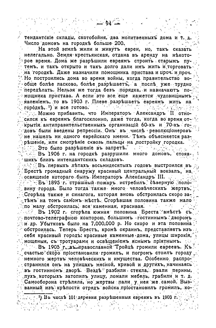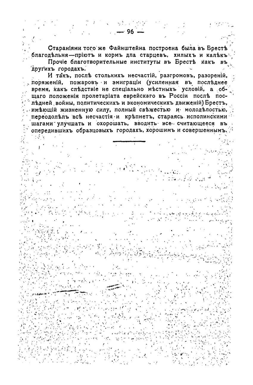 And so, after so many misfortunes, raids, bankruptcies, losses, fires and emigration (reinforced recently, as a consequence of specifically local conditions, and the general condition of the proletariat Jewish in Russia after the last war, political and economic movements) Brest, having vitality full of freshness and youth, overcome all adversity and gaining strength, trying to improve the giant steps, enter all believe in outstripped model cities, good and perfect.