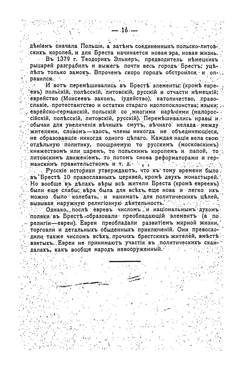 And mixed in Brest elements (except the Jews), Polish, polessye, Lithuanian, Russian and partly German, Jewish (Moeseev law, Judaism), Catholicism, Orthodoxy, Protestantism and the remnants of the old idolatry; languages: Jewish-German, Polish with many adverbs (Ruthenian, Polessye, Lithuanian, Russian). Customs and traditions mixed to increase the eternal unrest, perpetual discord between residents, word-chaos, members are never combined, are not educated never one whole.