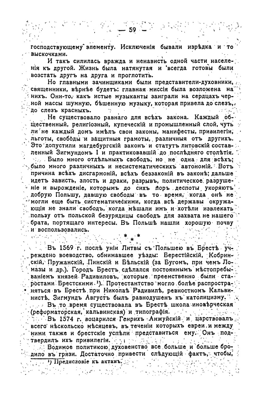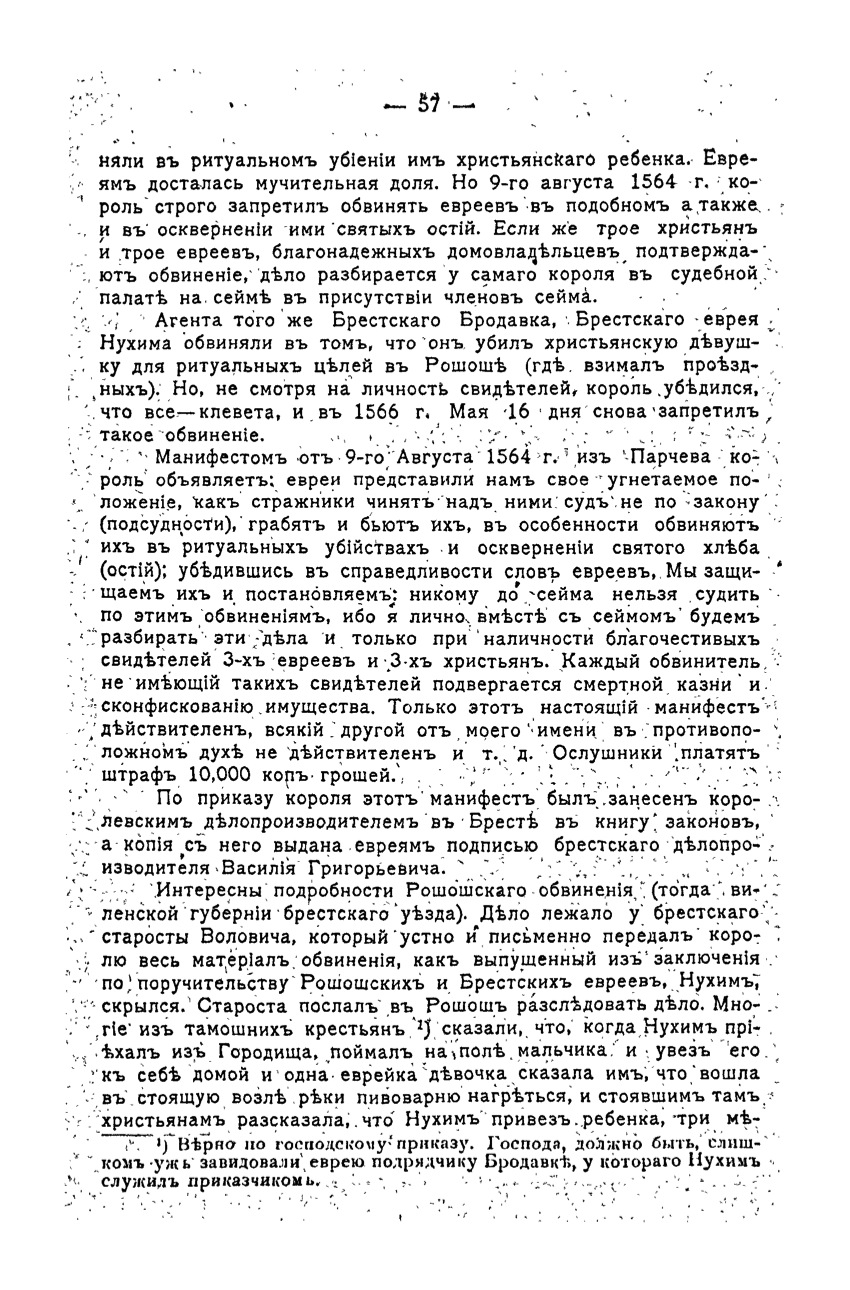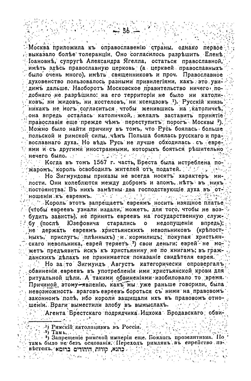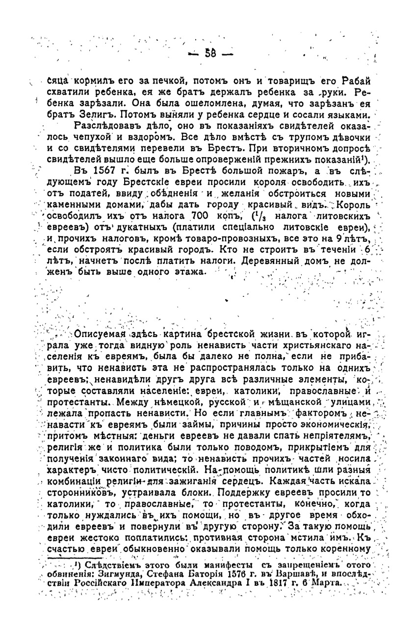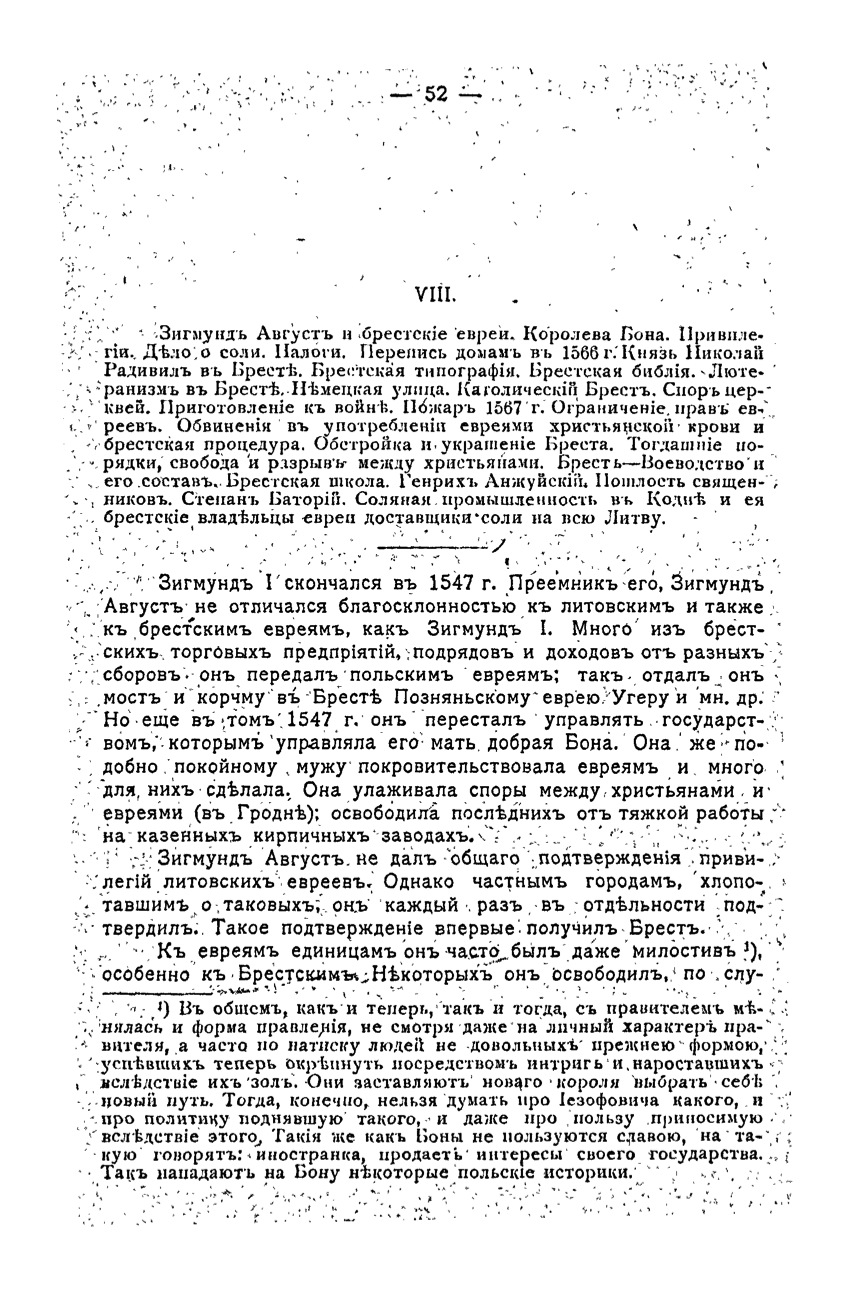 52}Sigmund died in 1547 his receiver, Sigmund August did not differ by the favor of the Lithuanian and also to the Jews of Brest as Sigmund I. Many of Brest, trading companies, contracts and income from miscellaneous charges passed on Polish Jews ; so he gave the bridge and restaurant in Brest Poznanski Jew Uher and many others. etc. But even in 1547 it ceased to govern the state which was run by his mother, kind of Beaune. She's like her late husband patronized Jews and did much for them. It settles disputes between Christians and Jews ( Grodno); freed from the last hard work on state brickworks.