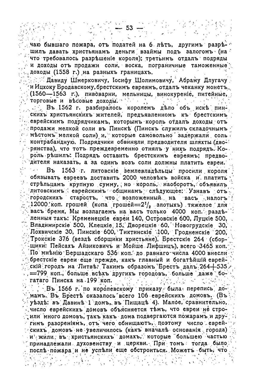 In 1563 Lithuanian landowners asked the King to oblige the Jews to deliver 2,000 troops and pay a large sum of musketeers, but the king contrary, announced the Lithuanian Jewish communities following: Learning from the city elders that entrusted to the vas 12,000 tax cop. pennies (pennies cop = 2.5 PLN ) heavy burden for you, We hold you only 4000 cop. divided as follows: 140 Kremenets Jews, Ostrovsk 600, Luck 500, Vladimir 500, Kliotsk 15, Dworeck 60, Novogrudskaya 30, Lohvichskie 30, Pinsk 600, Tiktinsky 100, Grodno 200, Trakai 376 (collectors everywhere Christians ), Brest 264 ( collectors : Pejsach Aizikovich and Moshe Lifshitz), total 3465 cop. According Bershadski 536 kop. to have an even number 4000 Brest Jews even before, as the main and richest Jewish city in Lithuania. Thus Brest gave 264 +535 = 799 kop., more than any other city, even more rich Pinsk 199 kopecks.
