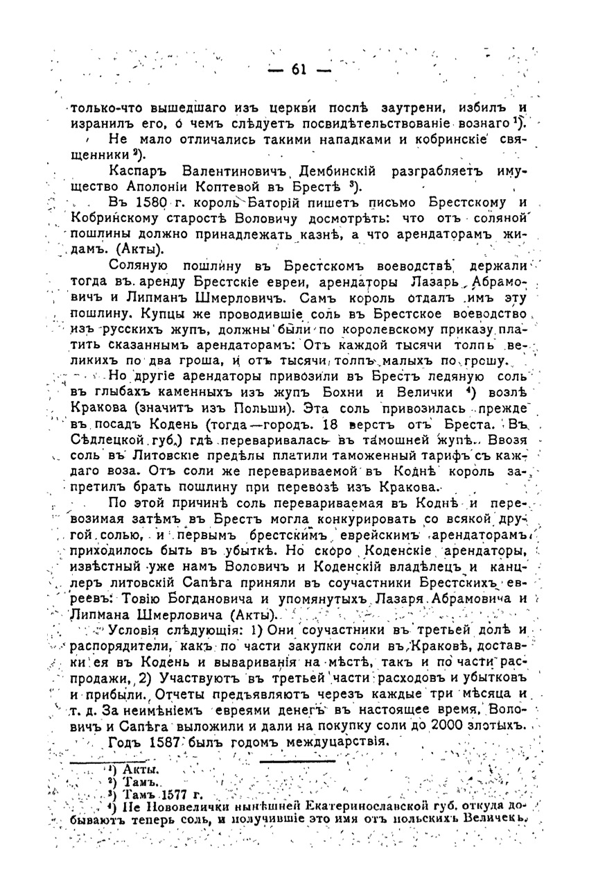 Hydrochloric duty in Brest province then kept for rent Brest Jews renters Lazar Abramovich and Lipman Shmerlovich. The king gave them this duty. Merchants brought salt in Brest province of Russian zhup, had to pay a royal order said tenants. From each of the of thousands great tolps to two grosz’s and of thousands small tolps at a grosz.
