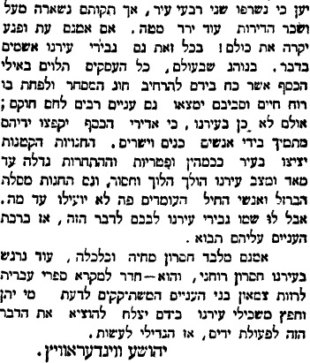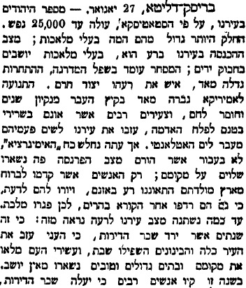 The number of Jews in our town according to the statistics is 25,000, the greater part – craftsmen. Making a living is difficult. Many are unemployed, trade is low and competition is strong. Emigration to America grew last summer because of hunger. Physically capable youth who can work in agriculture left to beyond the Atlantic. Now emigration has dwindled, not because the economic situation is better but because the people who emigrated told them of bad conditions. For the past 2 years rent pay decreased. Poor people left town, the 'middle class' became poorer, and the rich ones replaced them. Good, big houses are left with no tenants. There was hope for a higher rent because two quarters of town were burnt down.