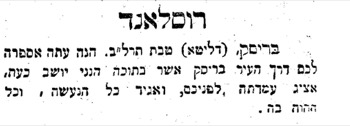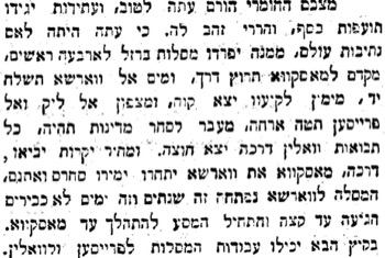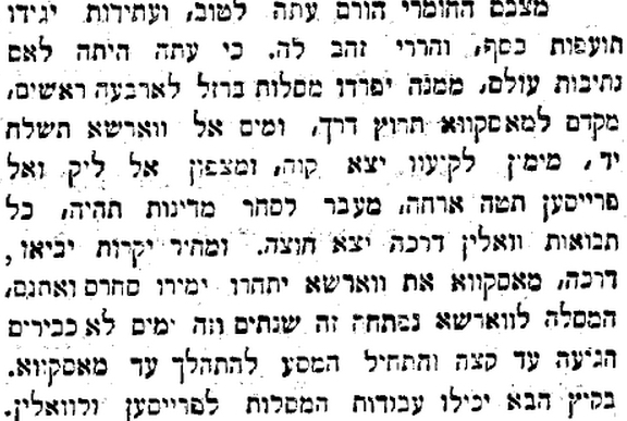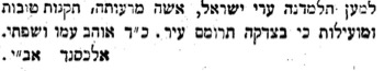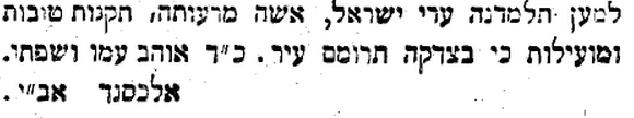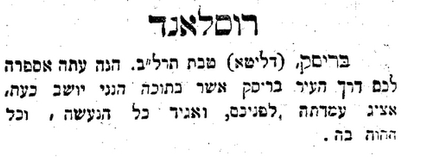 The writer, Alexand AV”I, [perhaps Avrahm, son of Israel], intends to inform his readers in other cities and towns about the greatness of Brisk, its glorious past, and present charity and prosperity. He wishes other cities to follow Brisk as an example of good takanot and charity.
