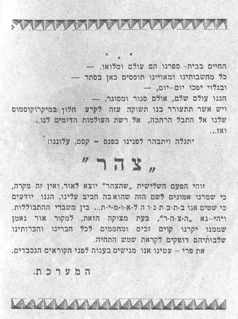 Tzohar is published and it is no accident, because we have been faithful to this name, so precious to us. We know that we are floating in the National Noah’s ark…on the surging waves of assimilation.