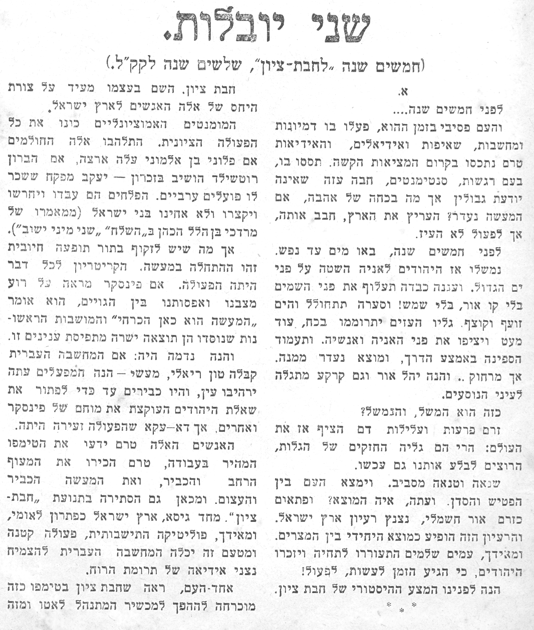 Hibbat Zion was based on emotional drives. Now, action was preached. Pinsker pointed at the dark and weak position of the Jews among the nations. Ahad Ha’am