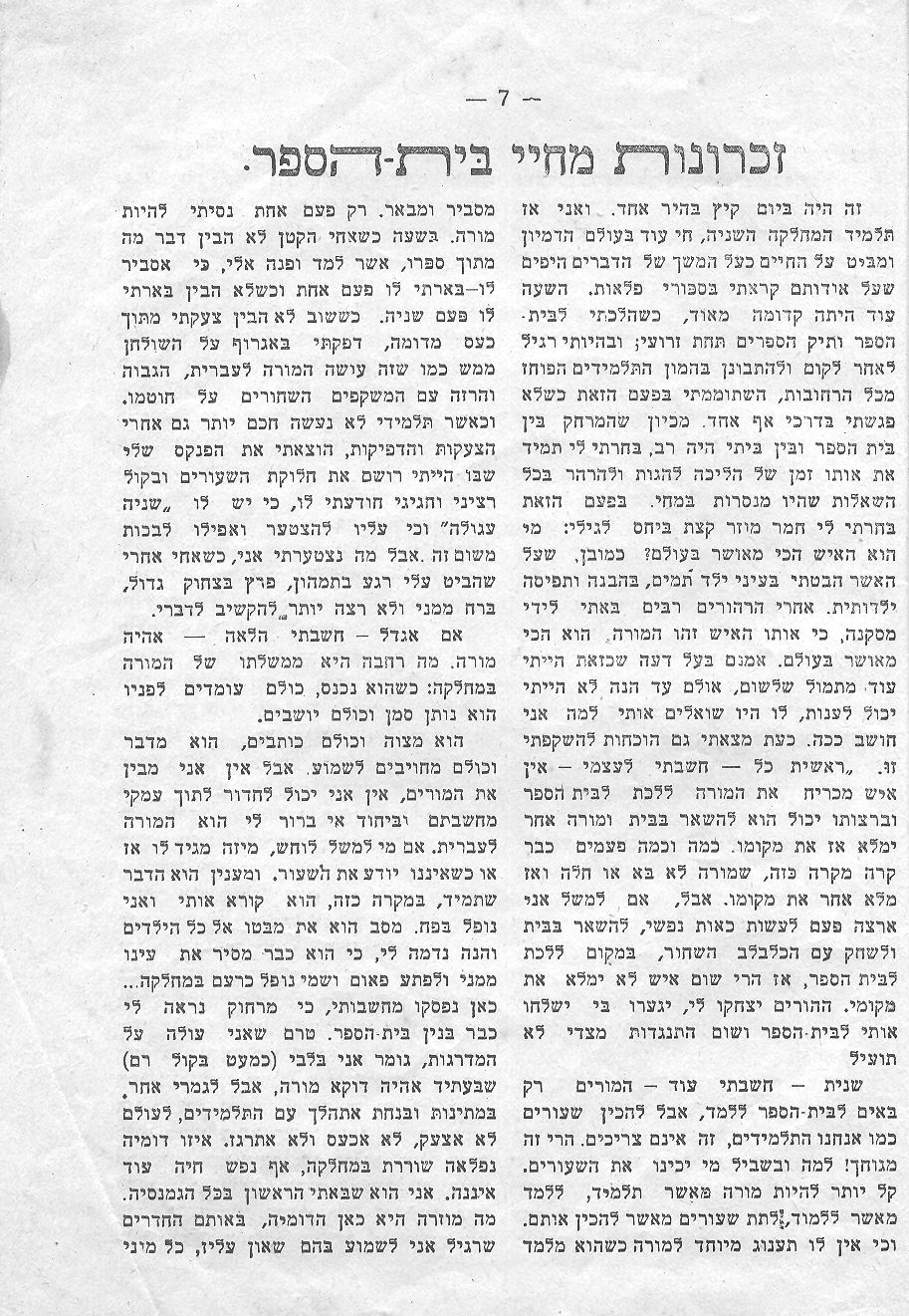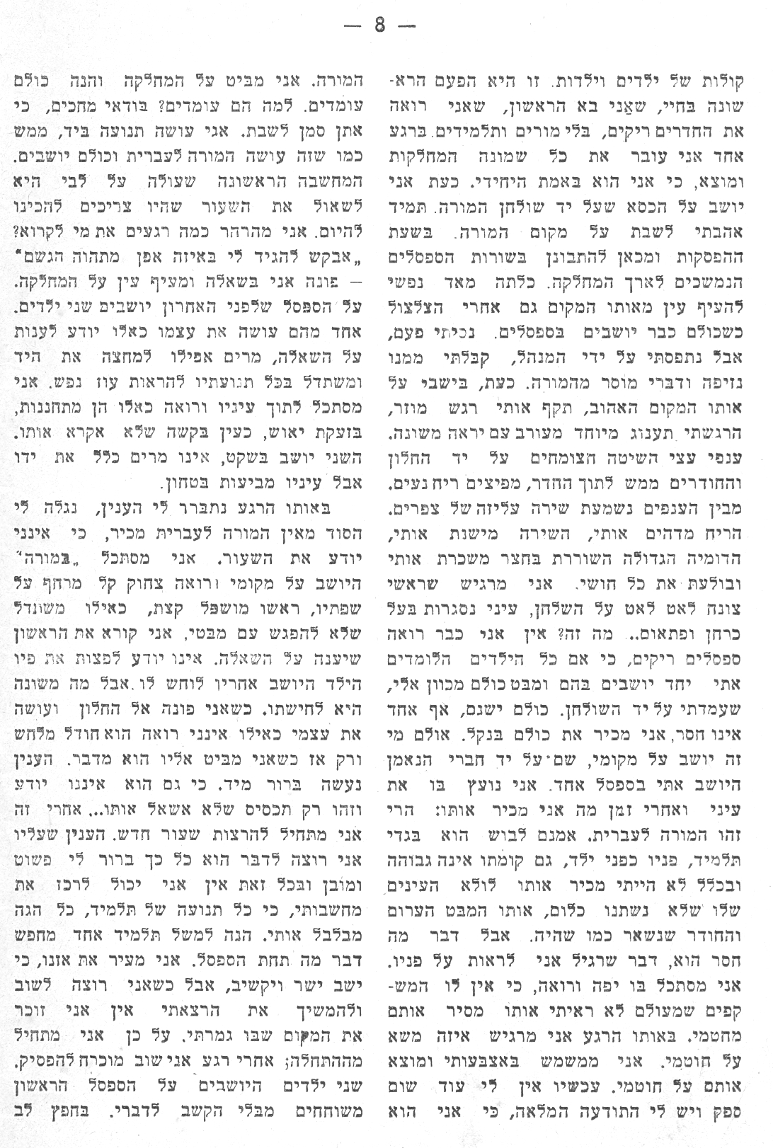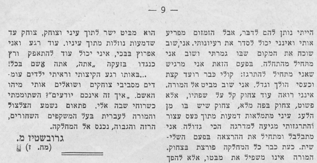 I cannot understand the Hebrew teacher in particular. Who tells him when somebody is whispering, or when one of us does not know his lesson. Very interestingly, he calls on me at such times and I am the one caught… His glance hovers over the whole class and I think he skips my face, and then suddenly he calls out my name…