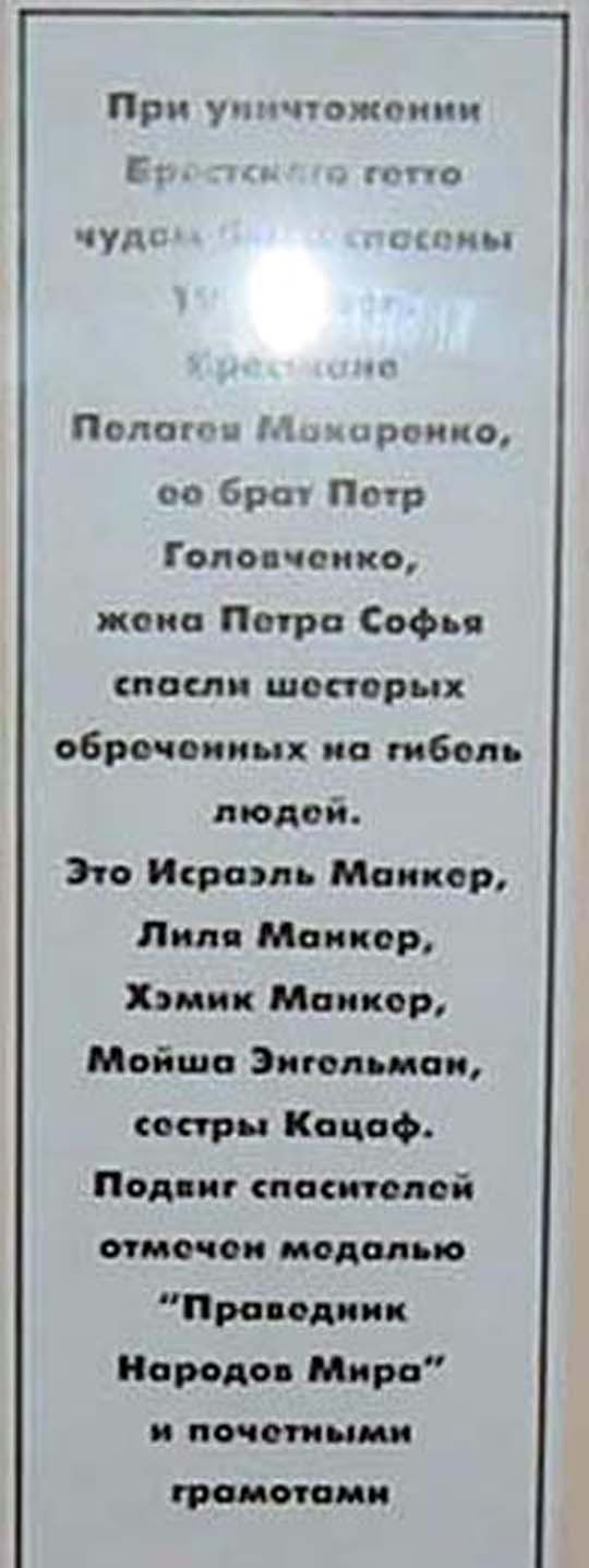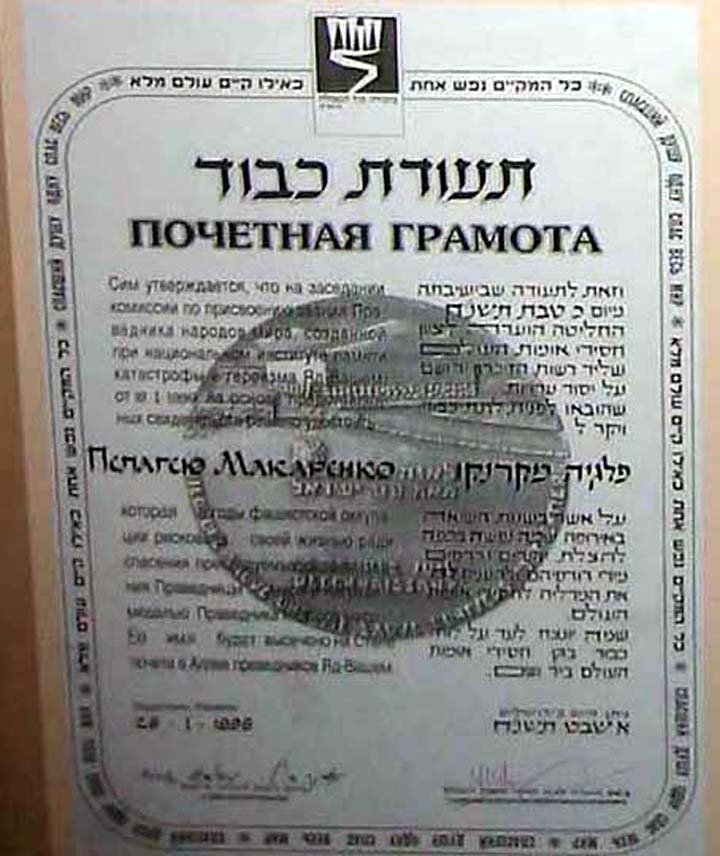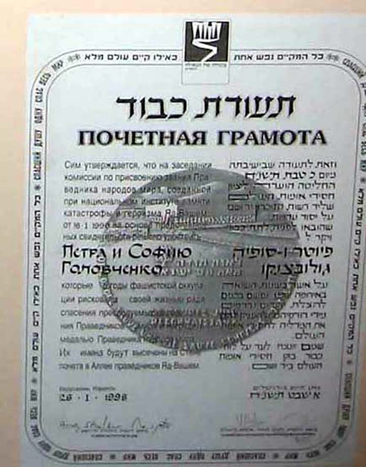 Sof'ya, saved six people who were doomed to die: Israel Malker, Lelya Malker, ?Khamik? Malker, ?Maysha? Engel'man, and the Katsaf sisters. The were awarded Peoples of the World and certificates of honor. |