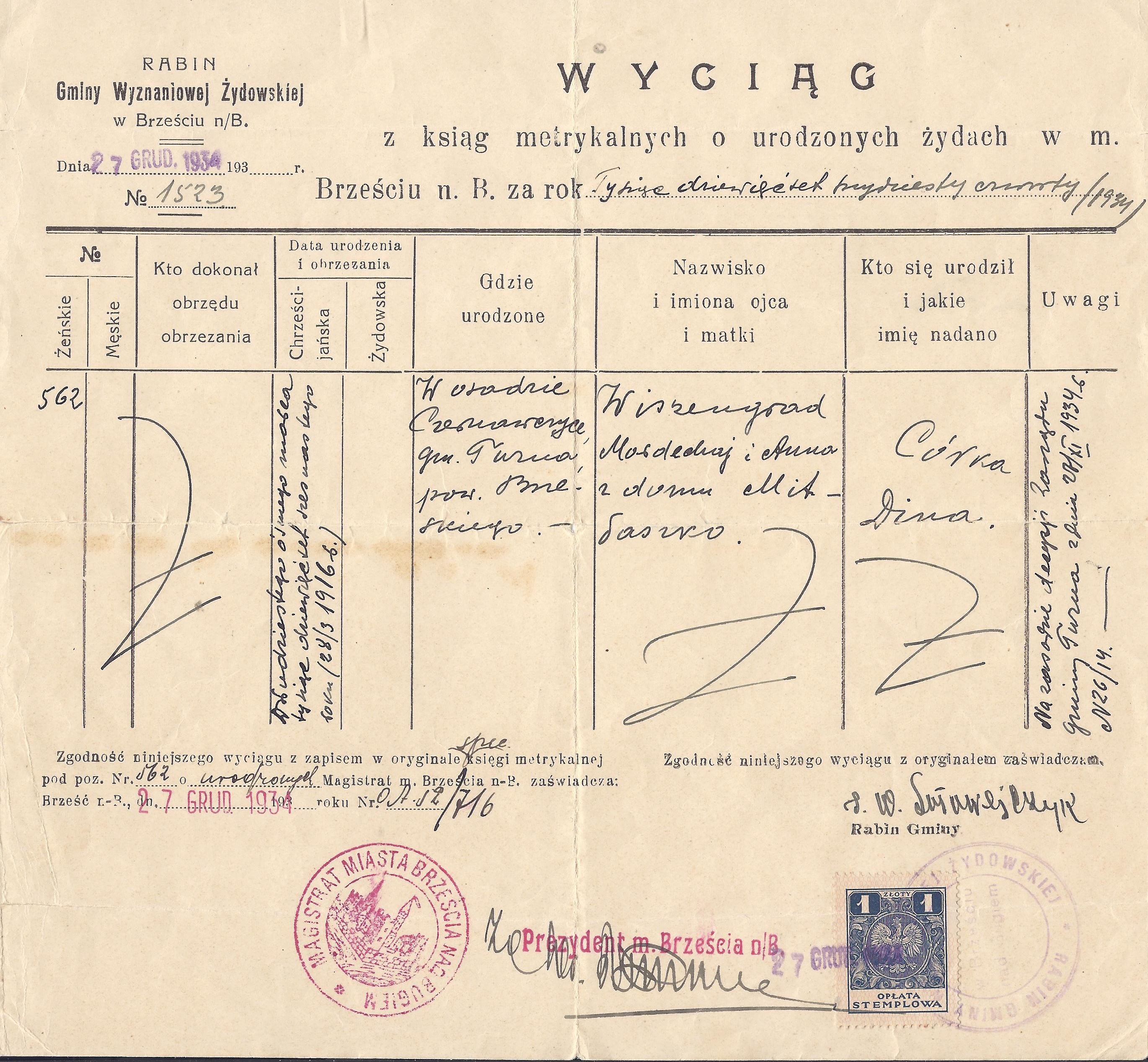 Issued by the Rabbi of the community of Brest – a birth certificate from the file of Jews born and registered in population-registry. Issue date: 27 December 1934.