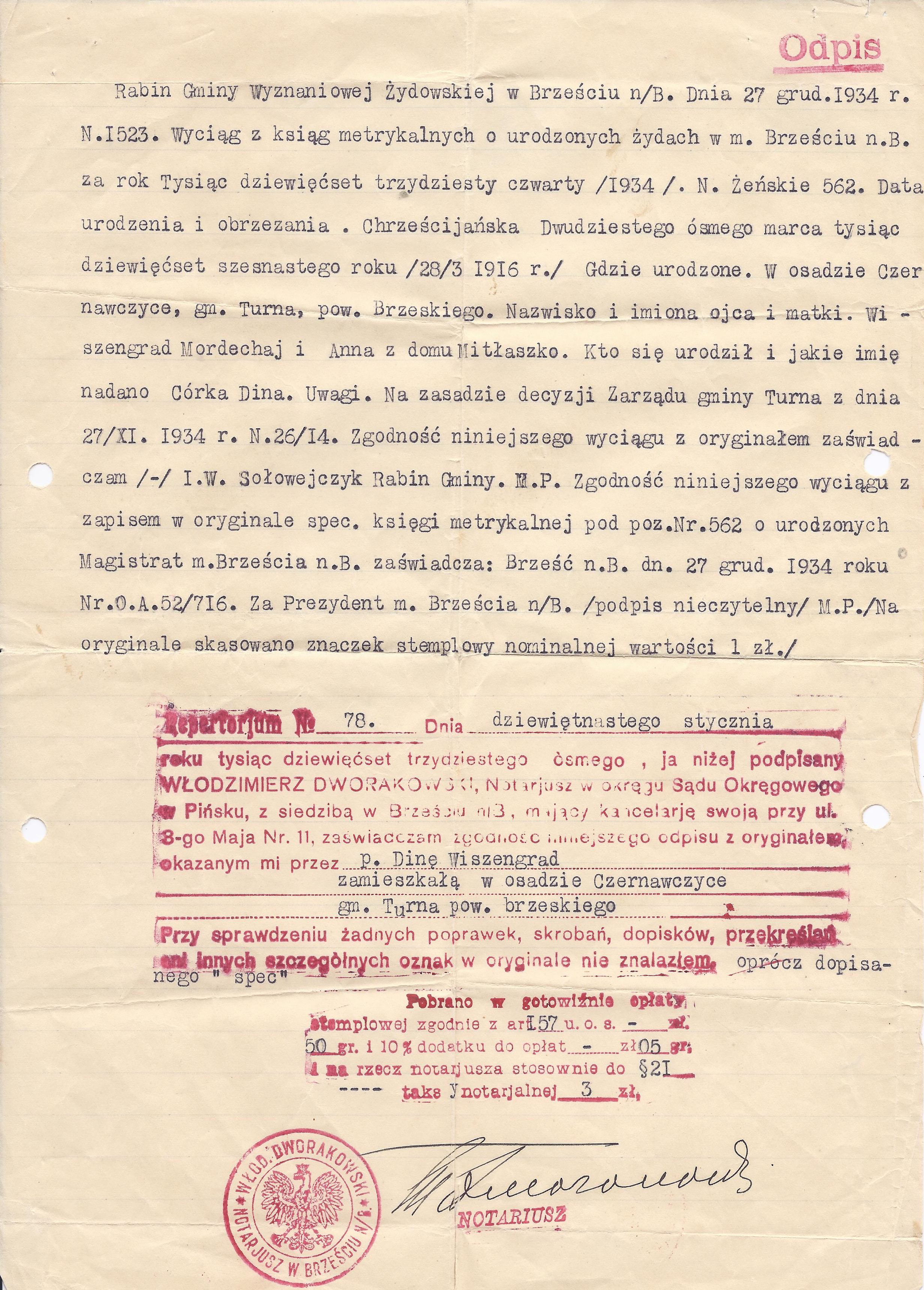 This is an affirmation, in a text form, of the birth certificate, above, with the signature of the Rabbi of Brest: I.W. Soloveitchik. It aims to affirm the birth certificate. This document has a stamp of a notary public in Pinsk via a Brest office, affirming that this text matches the original. Also a stamp of the mayor of Brest. A tax-stamp on the right. Issued: 19 January 1938.