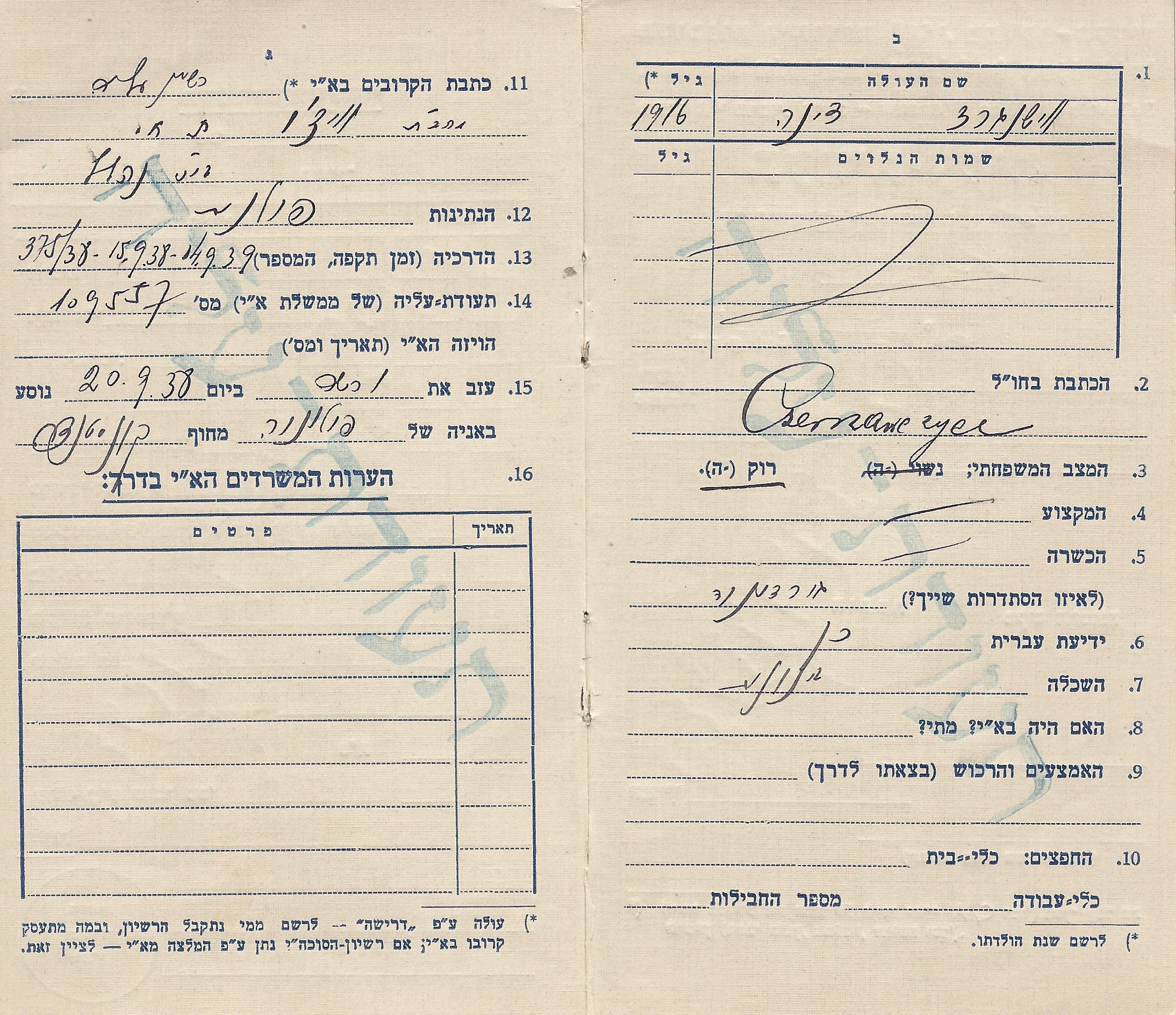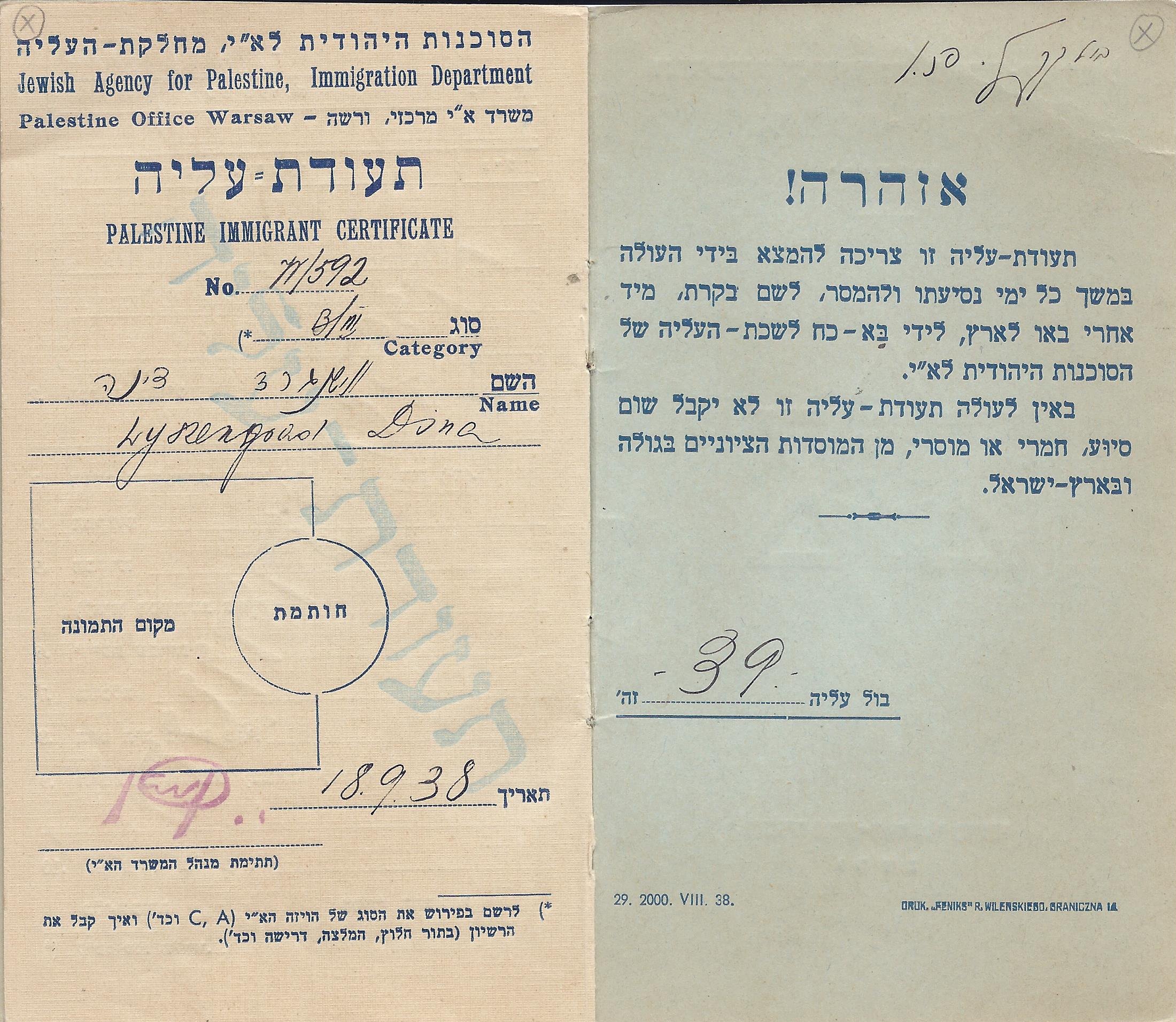Left: Jewish Agency for Palestine, Immigration Department, Palestine Office Warsaw Palestine Immigrant Certificate 18 September 1938. The category should cite the type of the Palestinian visa A / C and how he got it –as a pioneer recommendation, etc.,
