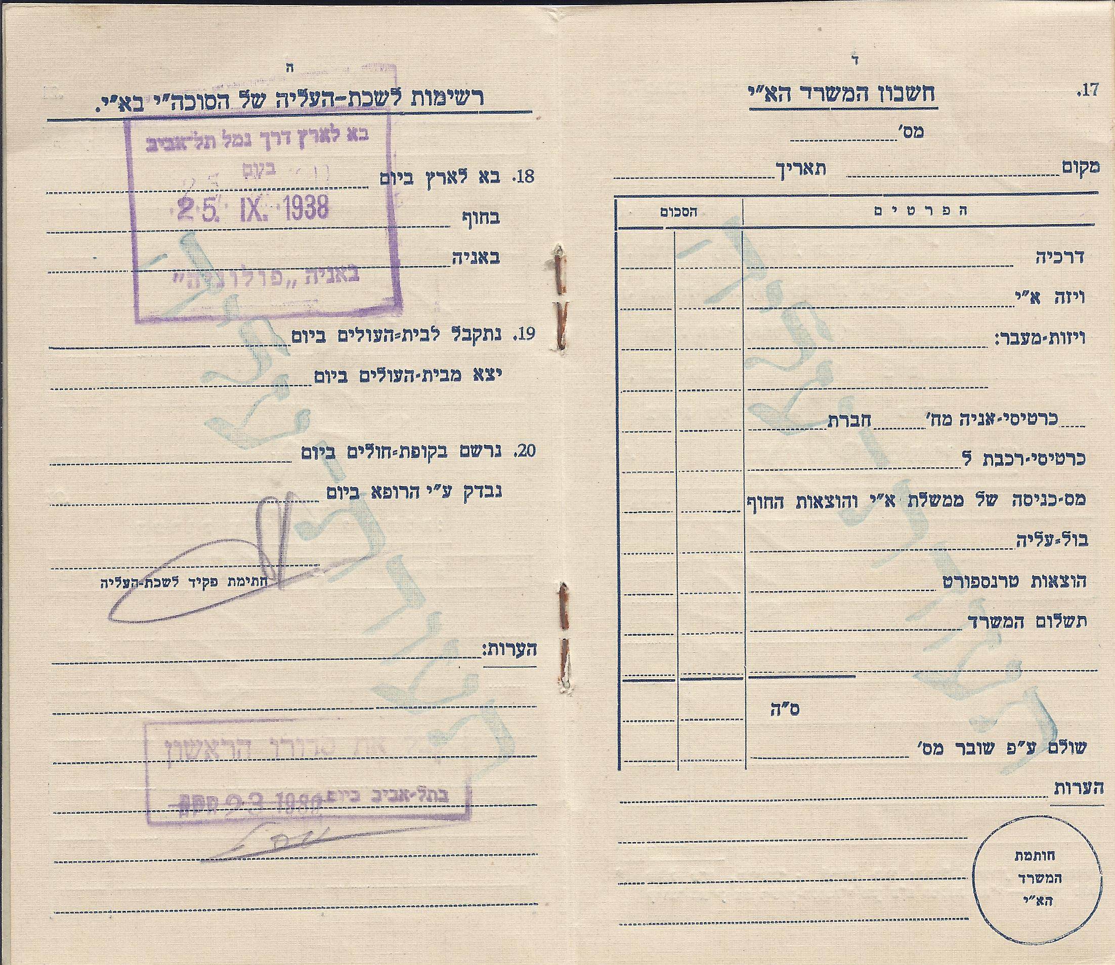 Left: The Jewish Agency in the Land of Israel, Immigration-department, Jerusalem, A certificate of Aliya [inside the Star of David] The Central Eretz-Israeli Office in Warsaw.