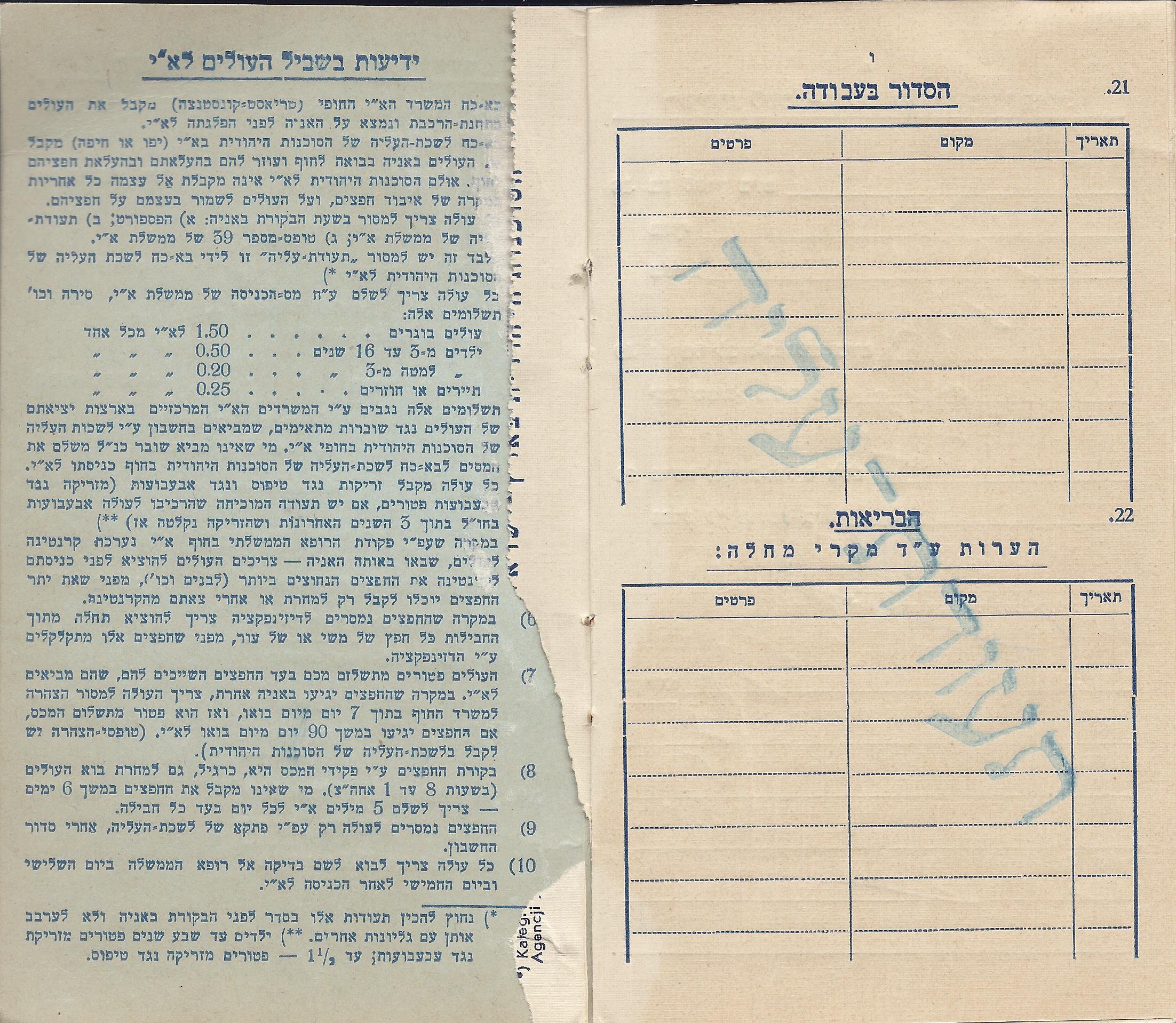 Right: Warning! This certificate must be in the hands of the immigrant during travelling, and –immediately upon arrival in the land– must be handed to representative of immigration department of the Jewish Agency in the Land of Israel. Without this certificate, the immigrant will not get any help – material or moral– from the Zionist organization in the diaspora and in the Land of Israel.