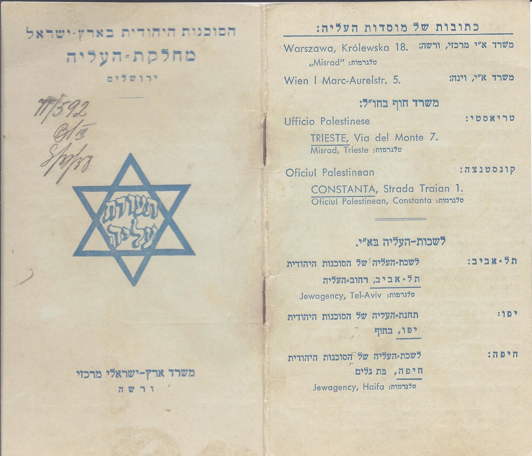 Right: addresses of the Aliya organizations in Warsaw and in Vien. In Triest, in Constanca In Tel-Aviv, Jaffa, and Haifa.