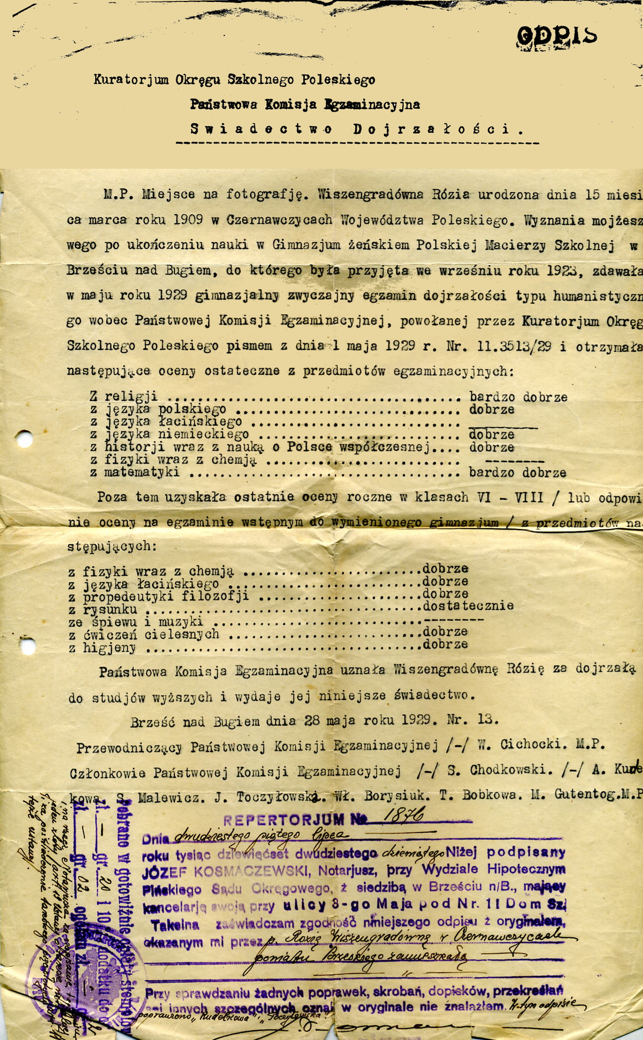 Shoshana (Rosia) Wizengrad's Certificate 1