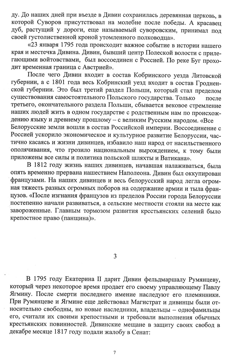 After this, Divin entered the Kobryn district of the Lithuanian province. In 1801, the Kobryn district entered the Grodno province. This was the third partition of Poland, after which Poland became a sovereign nation. Only after this, the final partition of Poland, does the fortune of our people take shape: to live in the same state as those akin to us by descent, language, history and customs – with the Great Russian people.
