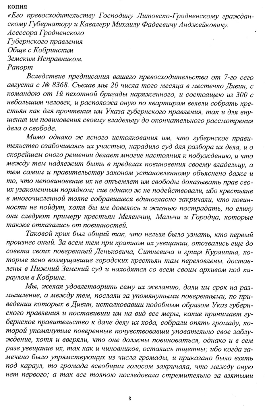 On account of these circumstances, your Excellency, we humbly ask for your command to take strict and immediate action. Given the amount of people in Divin’s disturbance, we ask to bring the people to the necessary obedience without bloodshed. For the peasants of the town of Divin are ready to not only martyr their belongings, but their lives for the sake of not having to obey. The above-mentioned towns of Melenchintsi, Gorodetz, Malch and some Logashin in the Minsk municipality – this is the extent to which resentment has spread. If it is not stopped in its infancy, then soon, important impacts can be born out of this.