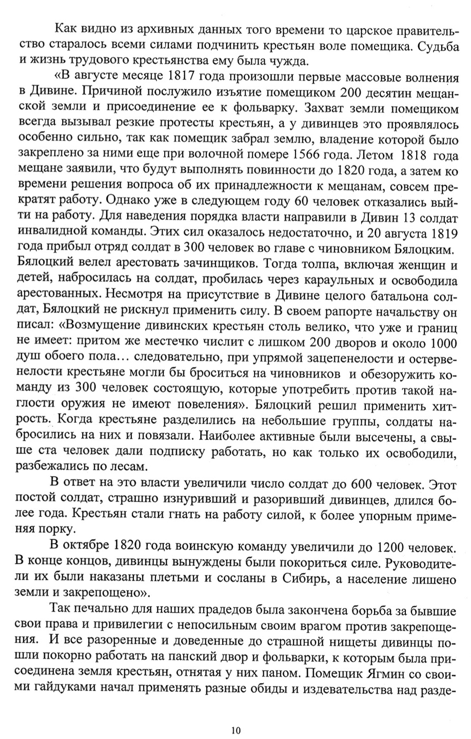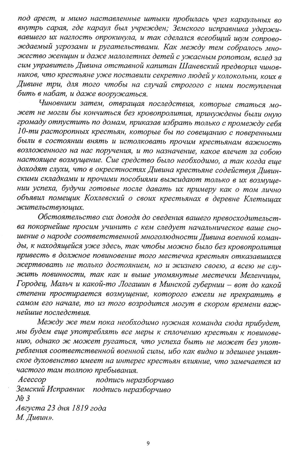 9} the arrested, which were already being kept in the barn. The crowd squeezed through the guards and their bayonets into the barn, where the detained were being held. The Zemsk police chief, who tried to hold back the crowd, was knocked off his feet. Along with the massive shouting, threats and insults against the authorities could be heard. Besides this, many women and even young children gathered, contributing to all of the noise. Then the lord of Divin, the retired Captain Shanevsky, announced to the officials, that the peasants secretly placed some trusted people at the bell tower. There were three such in Divin. This was to ensure that in the case of severe treatment to them, they could sound the alarm, and even take up arms.