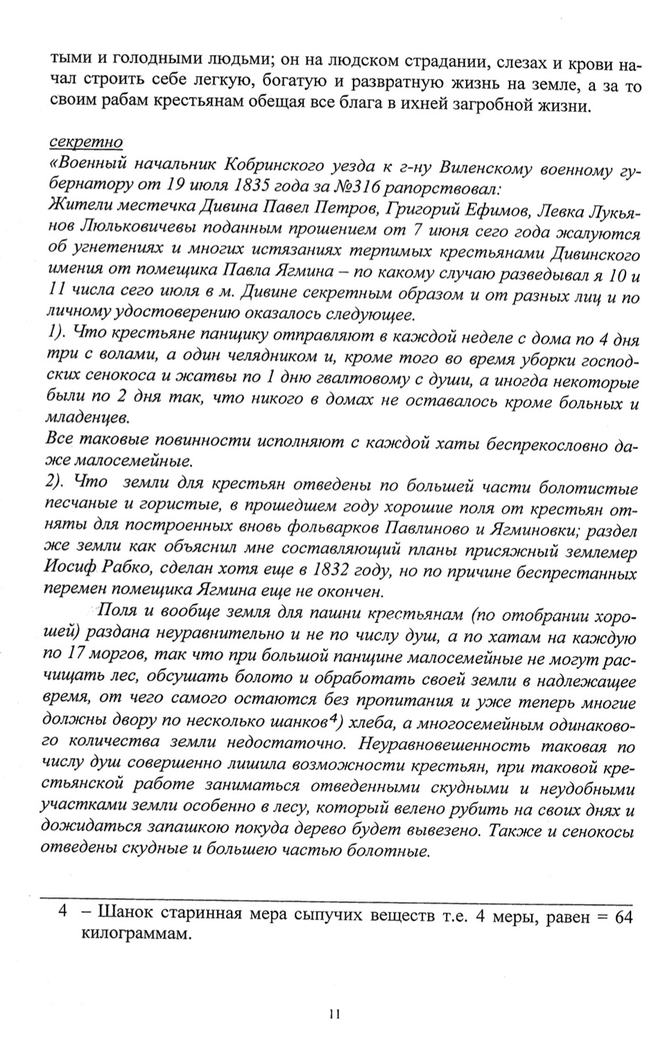 2) The peasants were dealt out land that was for the most part swampy, sandy, and mountainous. In the past year, good fields were taken away from peasants to build new farms for landowner Yagmin. (Under the village of Pavlinovo and Yagminovki, in the future). The division of land was created back in 1832. So I was explained by the sworn land surveyor Joseph Rabko. But because of landowner Yagmin’s constant changes, this division has yet to be completed.