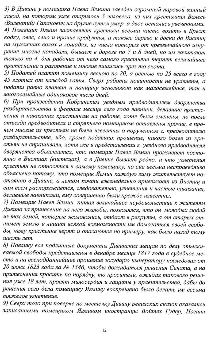 7) Landowner P. Yagmin expressed his concerns about the peasants of Divin, because they submitted complaints against him. He promised: young people from these families will be given away as recruits. From this families he will take away lands and deprive them of the right to work for their freedom. Peasants believe and fear that this is how it will be. This is how it was six years ago.