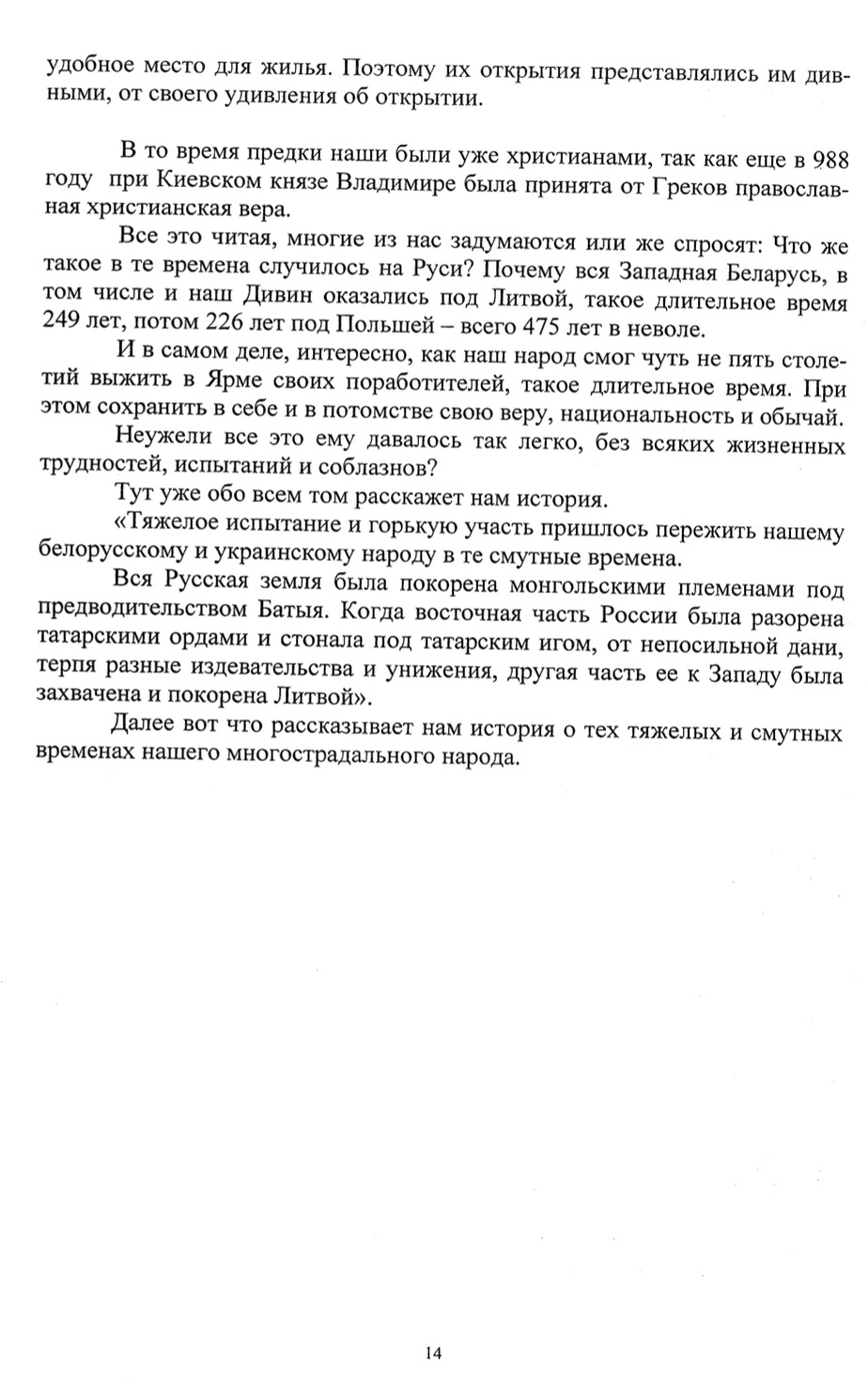 Reading these lines, many of us will wonder and ask: what happened those times in Russia? Why is all of Western Belarus, and in its ranks our Divin, turned out under the rule of Lithuania? For a long time – during the course of 249 years we were under the Lithuanian leadership. Then, another 226 years under the rule of Poland. In total, for 475 years – our people were captive.