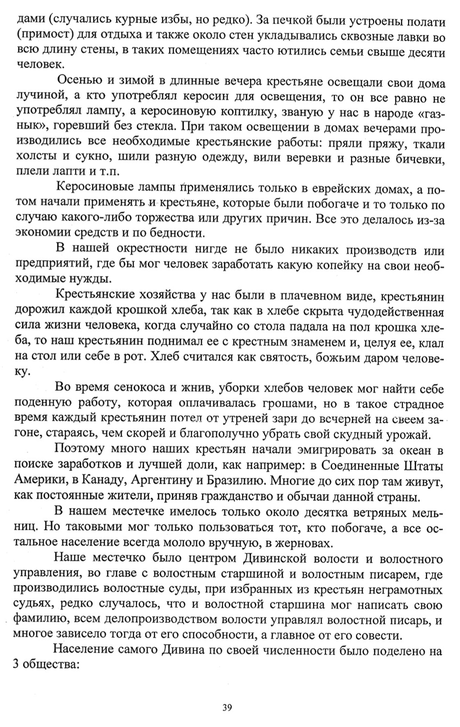 39} (old ones, without chimneys, existed, but were very rare). Behind the stove, typically, arranged were bunks for resting. Similarly, along all of the walls, extensive benches that spanned the entire length of the wall were attached. In such dwellings lived large families of ten people or more. Such are the Diviner homes preserved in my memory from childhood.