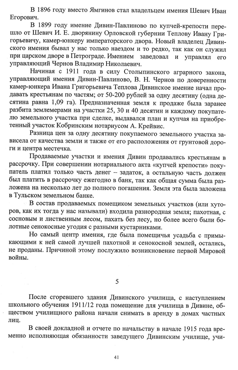 Beginning in 1911, the Stolypin agrarian law came to power, in accordance with which peasants were able to purchase land. The manager of the Divin estate, V. N. Chernov had the trust of the owner I. Teplov for the right to sell the land. This sale of parts began in 1911. The price was: from 50 to 200 rubles per one