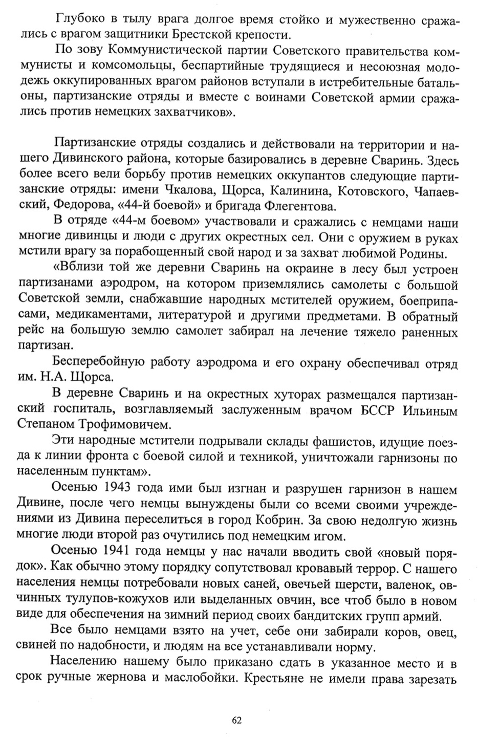 Guerilla groups were created and operated on the territory of our Divin district. They were located around the village of Svaryn. Here, an active battle against the German occupiers was led by the following guerilla groups: named Chkalov, Shors, Kalinin, Kotovsky, Chapaev, Federov, 44th Combative, and Flengentov Brigade.