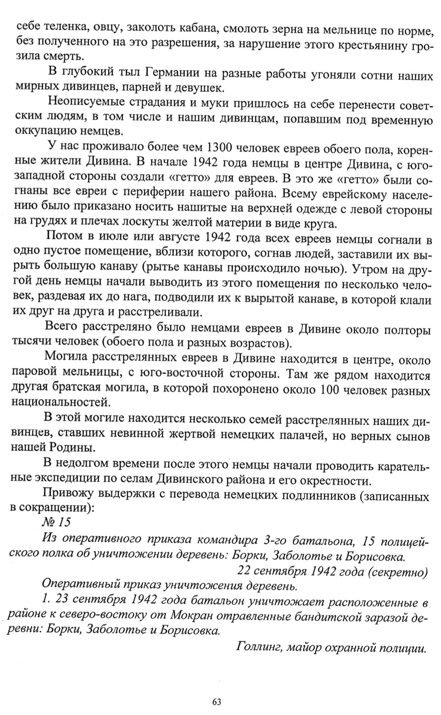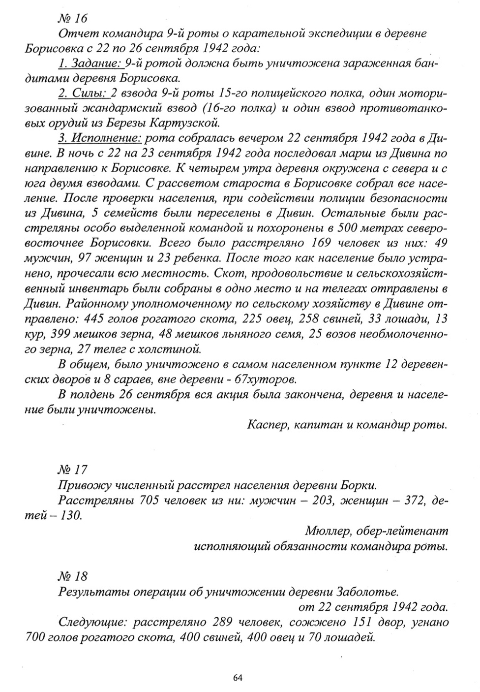 rd of September, 1942, a march was led from Divin to the direction of Borisovka. By four in the morning the village was surrounded from the north and south by two platoons. The mayor gathered all of the people of Borisovka at dawn. After verification of the inhabitants, five families considered trustworthy were allowed to leave for resettlement in Divin. The rest of the residents of Borisovka were shot by a specially-selected team. All were buried 500 meters to the northeast of the Borisovka village. A total of 169 people were shot. Of these: 49 men, 97 women, and 23 children. After this act, the police combed the whole area around the village in search of possible survivors left alive. All of the cattle, rural inventory was gathered and sent to Divin. Sent were: 445 heads of large, horned cattle, 225 sheep, 258 pigs, 23 horses, 13 chickens, 399 bags of grain, 48 bags of flax seed, 25 carts of grain, 27 carts of canvas.