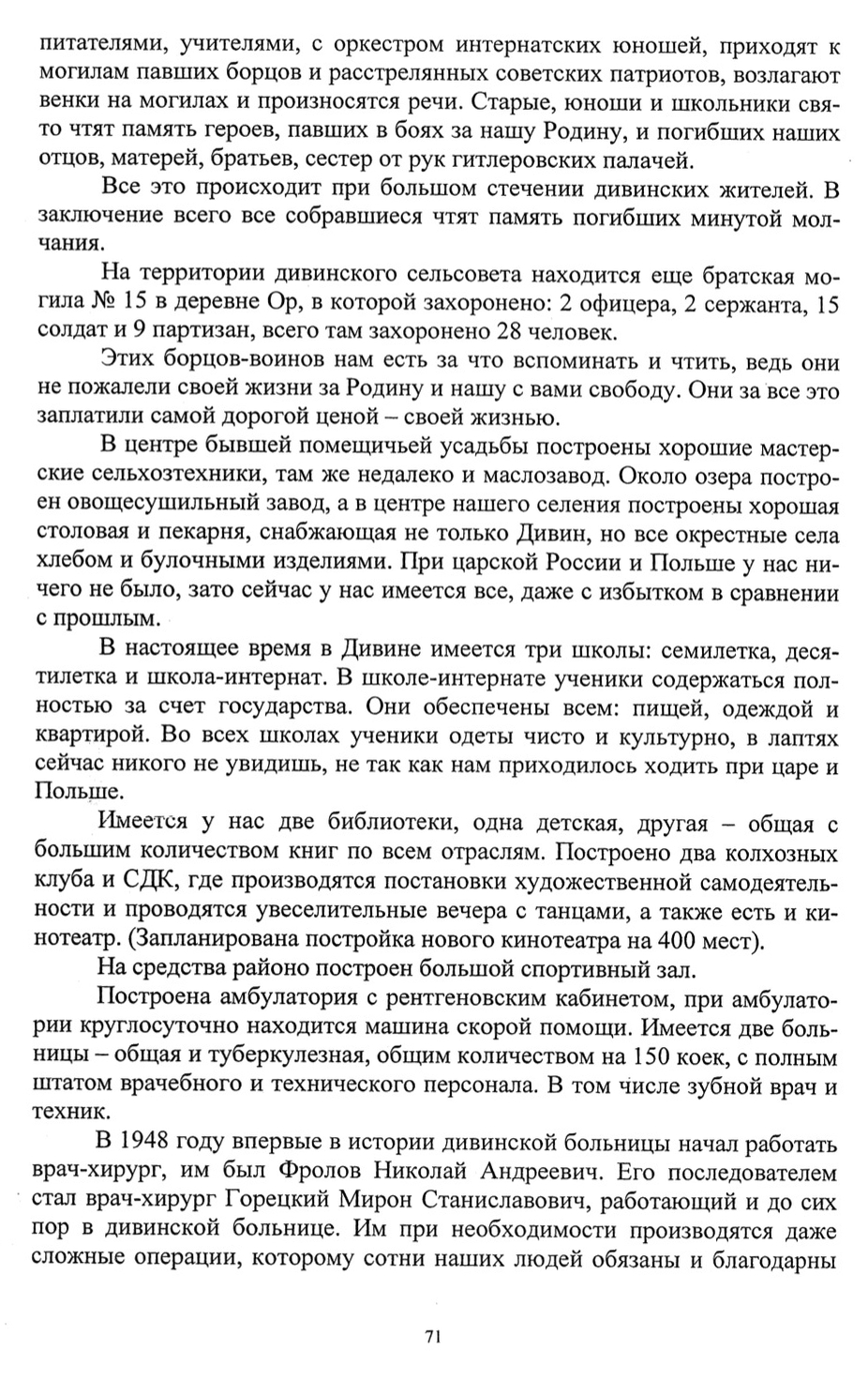 71} teachers, with an orchestra of the youth from the boarding school) come to the grave of the fallen fighters and shot patriots. They bring wreaths and flowers, deliver speeches. Inhabitants of Divin of all ages hold sacred the memory of the heroes who gave their lives in the fight for our homeland. They remember all of our fathers, mothers, brothers and sisters who have died at the hands of Hitler’s executioners.