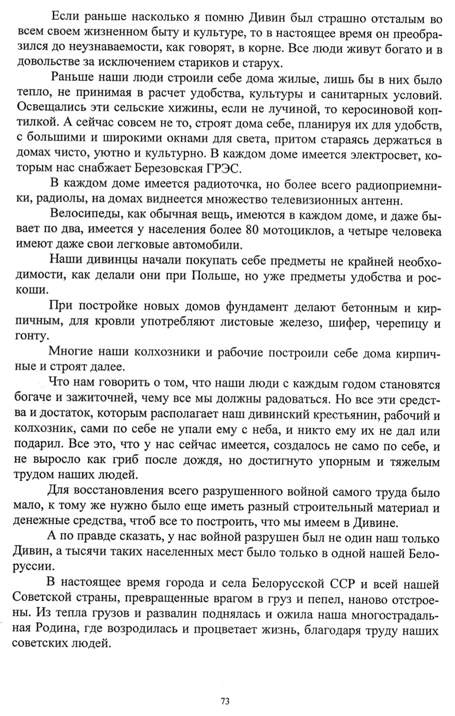 Previously, our people built themselves simple homes for shelter. The main objective was to have a home that was warm, leaving behind any considerations for convenience, beauty, and sanitary provisions. None of the homeowners thought of these things. These were not houses, but rural shacks. For lighting, they used splinter or kerosene lamps. Now, everything has changed. Houses are built strong, with big, wide windows for light. Amenities are planned to be inside of the houses. The houses are kept clean, comfortable, and equipped with furniture. Every house has electric lighting, which we are supplied with from the Bereza Hydropower Plant, which was built during the Soviet regime.