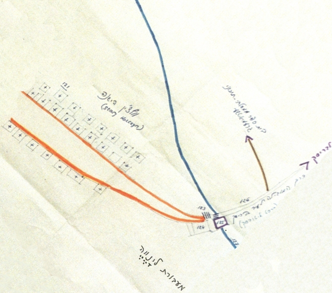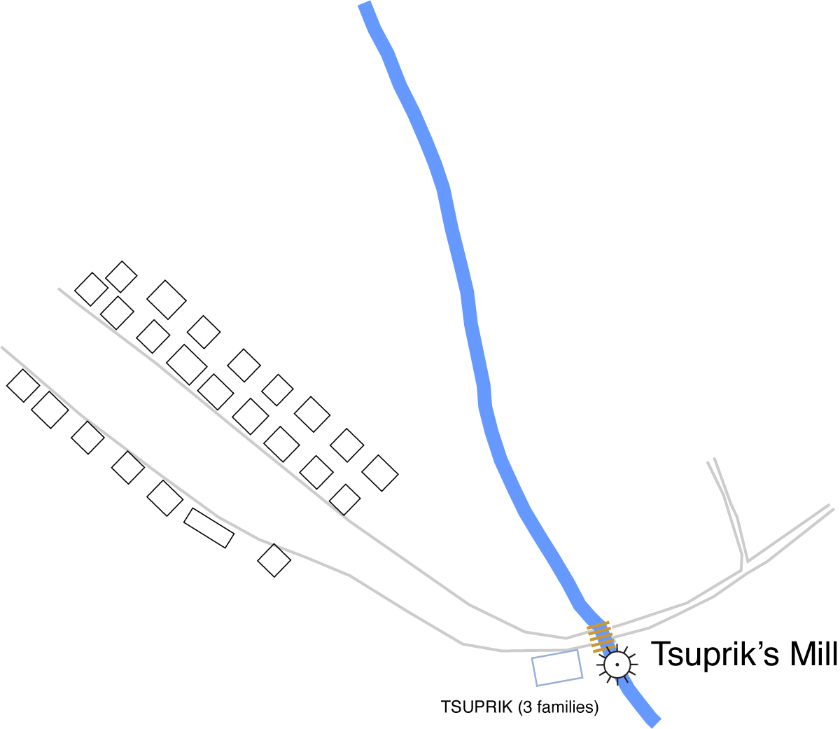 [Added by the editor:] This map shows the South-Eastward continuation of Volchin's main street, shown in exaggerated scale. As the distance from the center of Volchin increases, the road returns to more reasonable --and probably more accurate-- scale. There was a bridge at the river crossing, with the TSUPRIK families dwelling together near their mill, the only Jewish family in this part of Volchin.